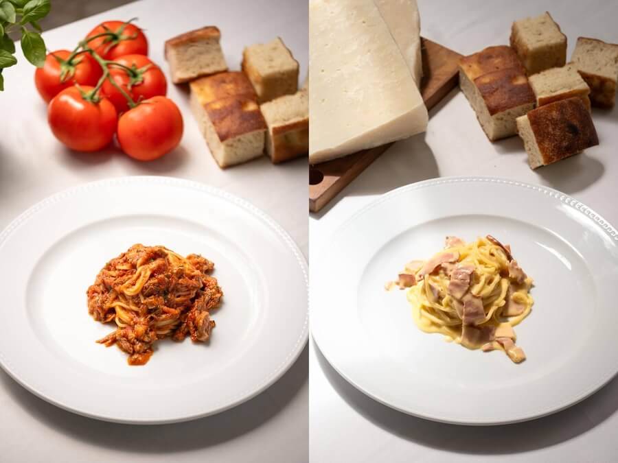Com guanciale romano DOP, molho tomate caseiro e queijo pecorino DOP. Ligeiramente picante.