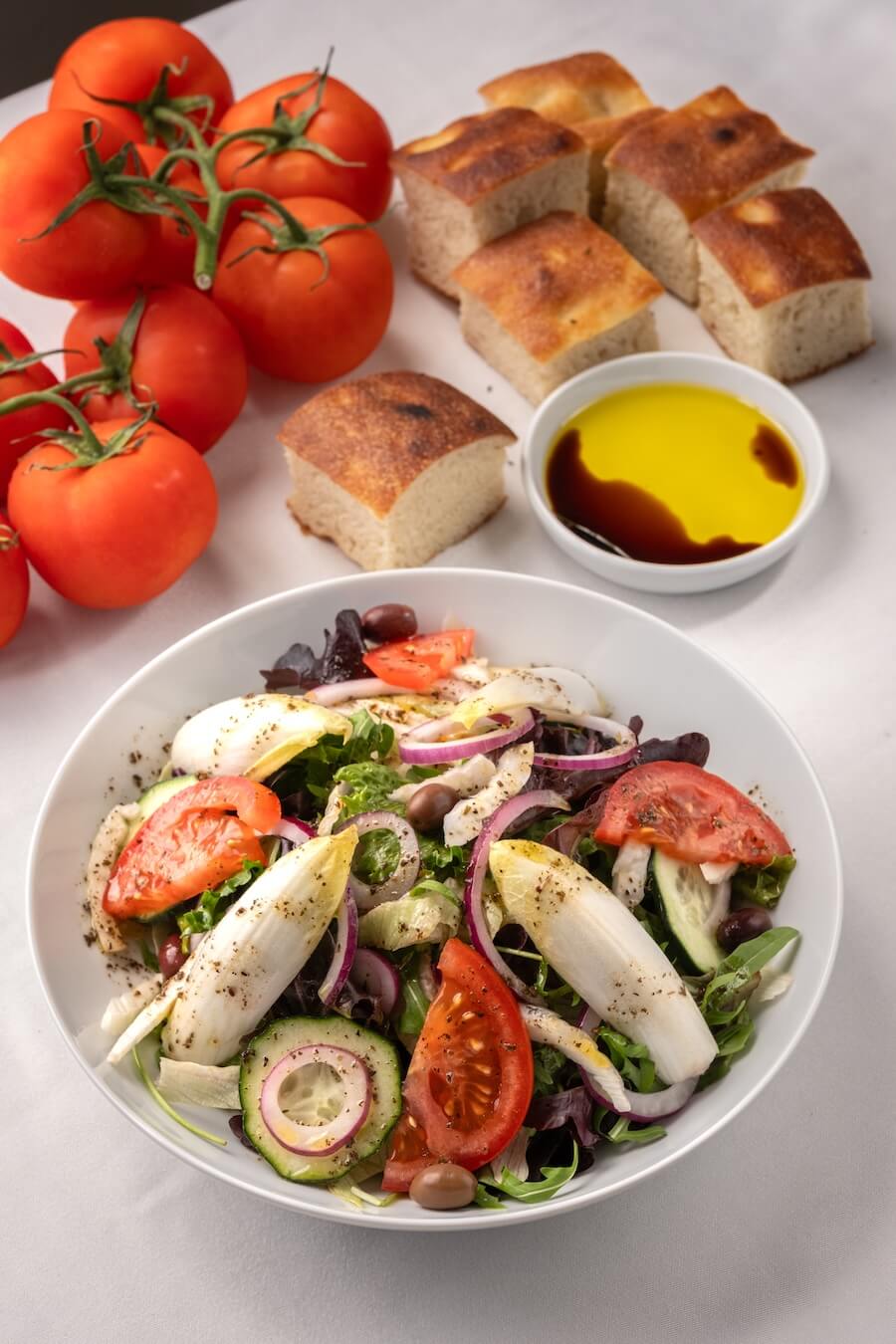 Variedades de mini alface, rúcula, azeitonas galegas, funcho, tomate, endívias e cebola.