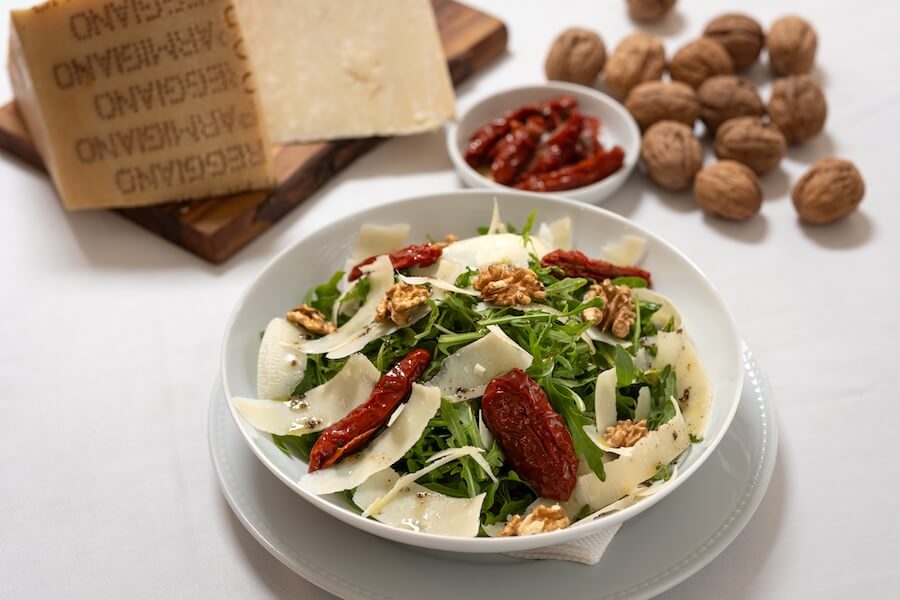Rúcula, parmigiano reggiano vacche rosse DOP, tomate seco e nozes nacionais.
